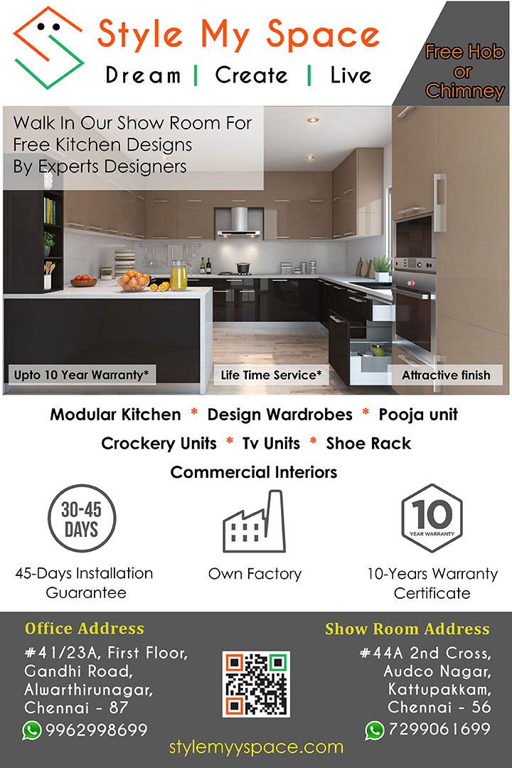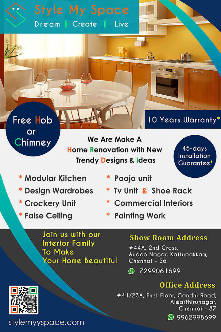 | Style my space Modular Kitchen have young and powerful team in Chennai. we gives you a different ideas of Interiors and Exterior on New arrivals and various budgets of specification. We offer free design and deliver a modular kitchen & interior in Chennai. Beautiful Home Interiors Delivered in 45 Days Or we pay rent. We Design Your Dream Home. Get Free quote and Designs for modular kitchen as your taste and budget. |