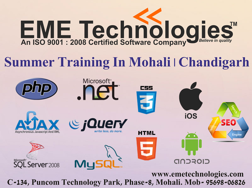 Summertraining in Mohali provides by EME technologies. EME technologies offer greatSummer industrial training with the Live project in Mohali. We provide greatsummer training through which student achieve and strengthen their basicknowledge in Mohali. EME technologies deal with JAVA, PHP, .NET, CCNA, CCNP,Android, Cloud Computing, AutoCAD, Solidworks, StaadPro, Embedded System, PLC& SCADA, MATLAB, many more summer training in Mohali.