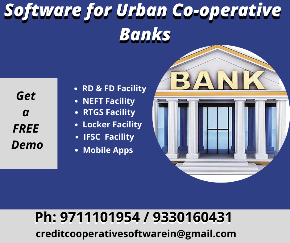 We are offering advanced software for urban cooperative banks in Delhi. We have developed this urban cooperative banking software with RD, FD, RTGS, NEFT, IFSC facilities. You will get more features in this software. This software is customized so that you can use it very easily. If you need a free demo or trial then you may contact us at 9711101954 / 9330160431 or email creditcooperativesoftwarein@gmail.com. No charge applies for an online free demo.
